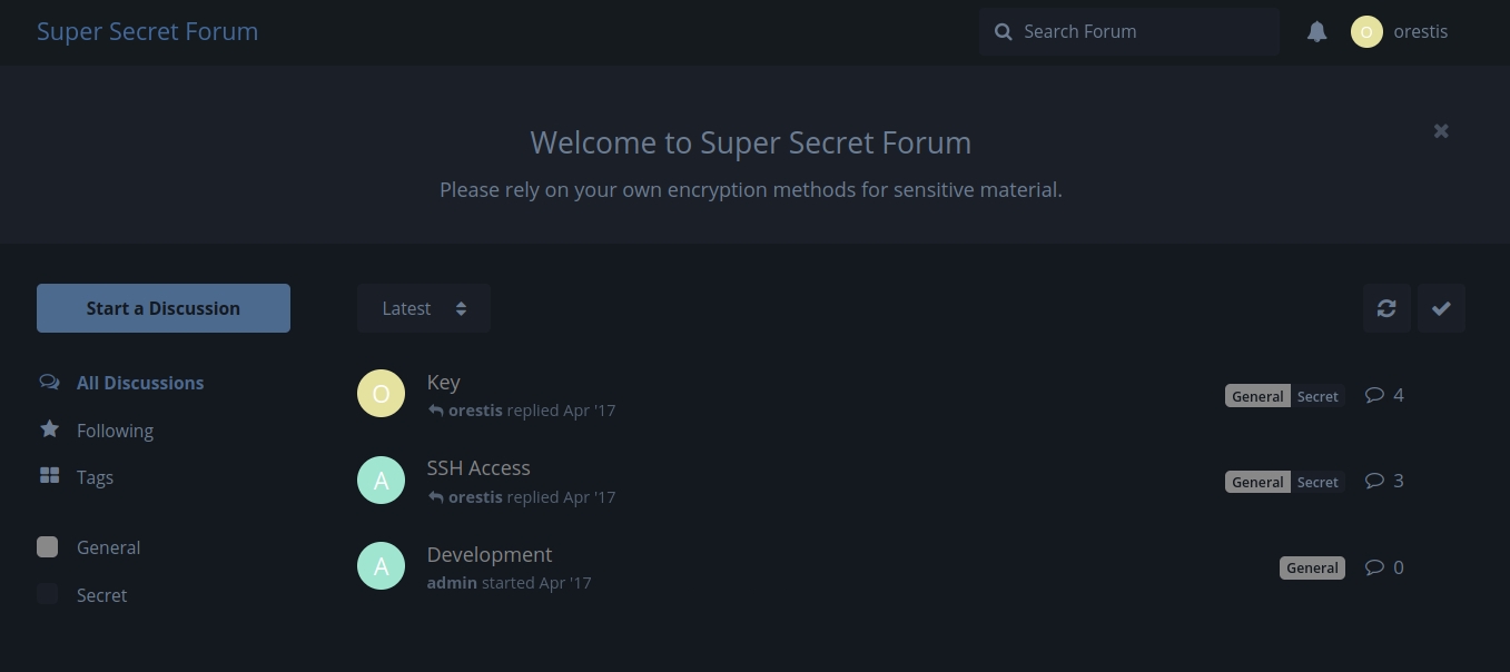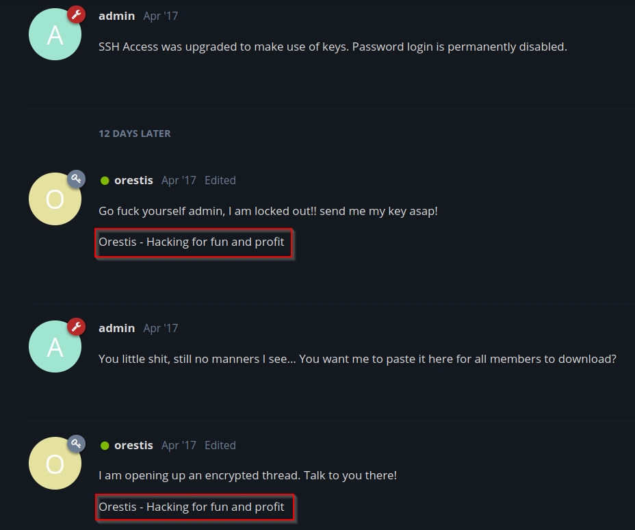 In the thread "SSH Access", we can learn that Orestis is a really nice person and there is an "encrypted" thread. Also note that Orestis has a "signature template": each thread ends with Orestis - Hacking for fun and profit