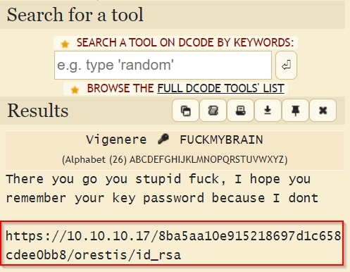 $ wget --no-check-certificate https://10.129.1.1/8ba5aa10e915218697d1c658cdee0bb8/orestis/id_rsa