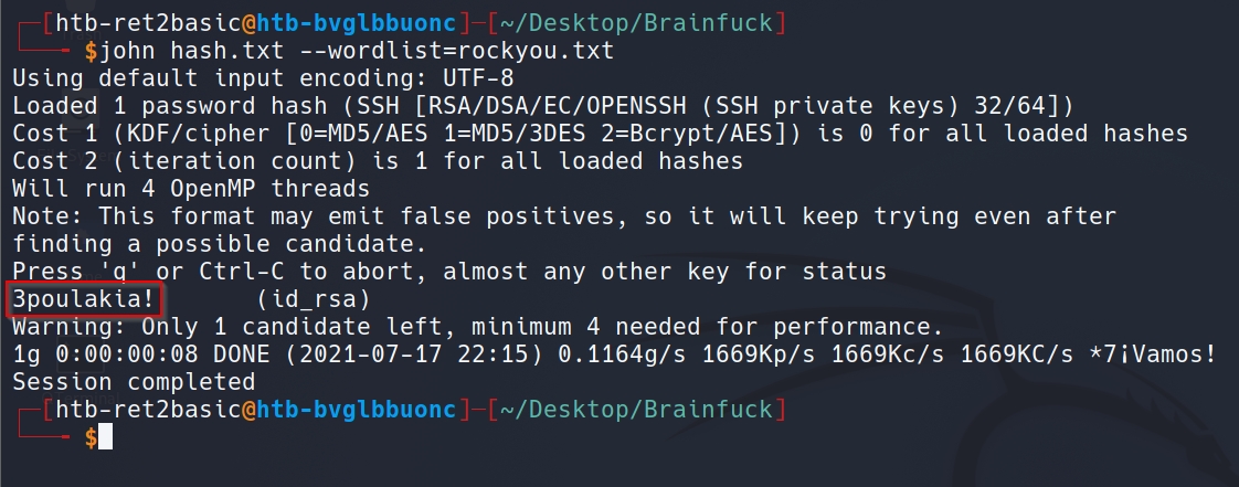 Note that this SSH private key is encrypted and we need to brute-force the password. This password will be used when we SSH in as Orestis. First, we need to do ssh2john