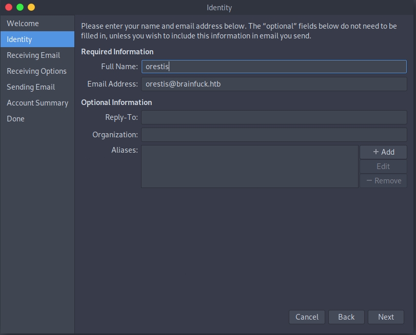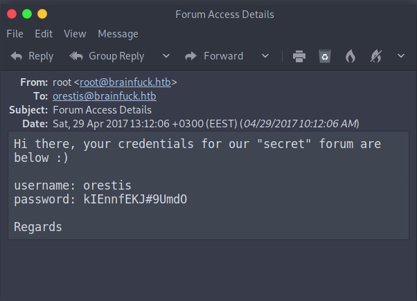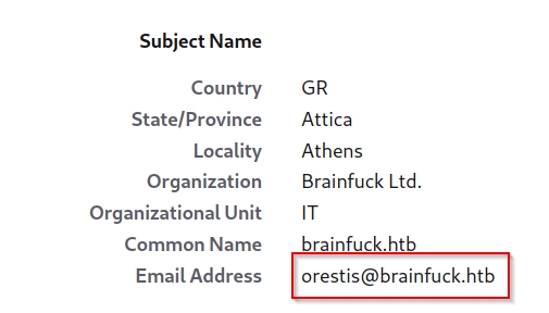 First, we get an email address orestis@brainfuck.htb