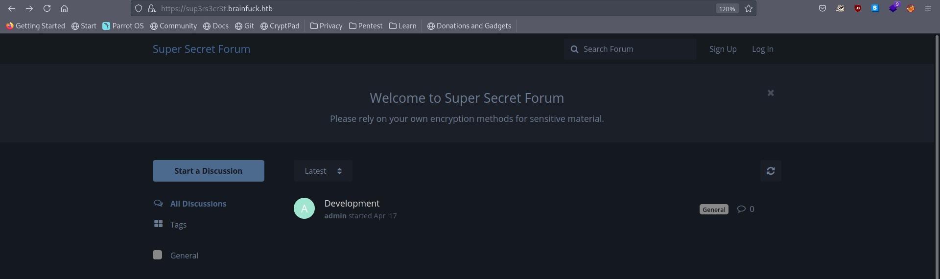 In the enumeration phase, we investigate the SSL certificate and learn two DNS names. One name points to a WordPress site and the other points to a "secret forum".