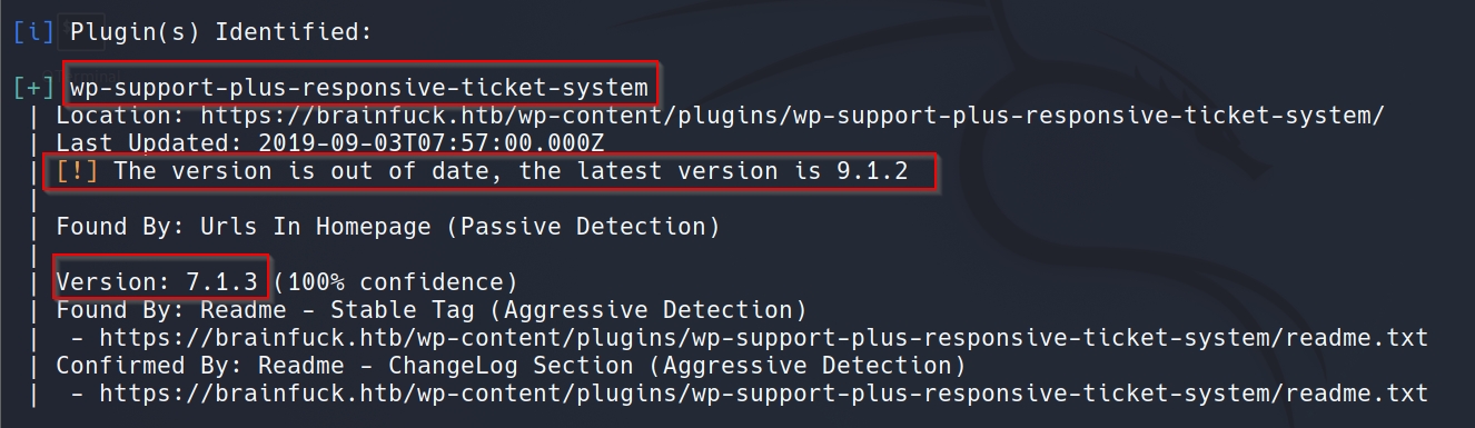 . In this case, WPScan finds an outdated plugin named wp-support-plus-responsive-ticket-system