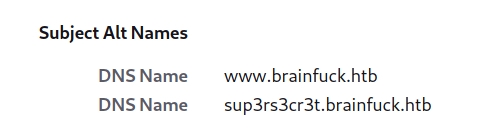 Next, we get two DNS names www.brainfuck.htb