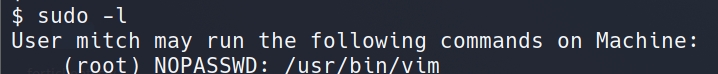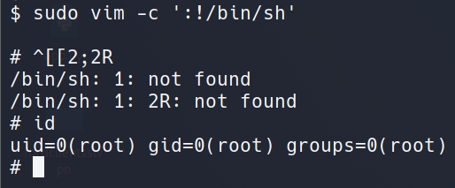 In the privilege escalation phase, we find we are able to run Vim as root from sudo -l