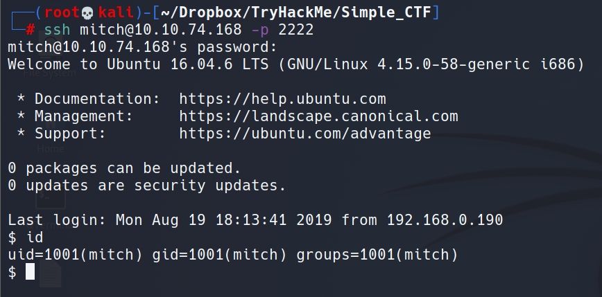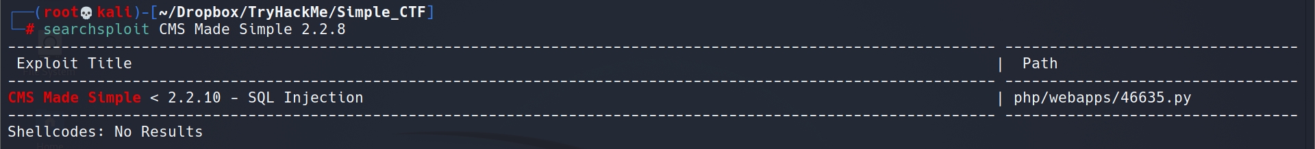 directory on port 80 which hosts CMS Made Simple 2.2.8. This service has an unauthenticated SQL injection exploit. The exploit finds a SSH credential for us and we can SSH in to get a user shell.